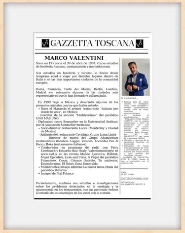 Marco Valentini es un embajador del estilo de vida italiano en México, nacido en Italia y formado en la prestigiosa escuela de hotelería de Florencia. Su trayectoria se ha construido a través de una experiencia internacional en ciudades como Berlín, Londres, Madrid y diversos destinos italianos, donde desarrolló una visión integral de la hospitalidad, el vino y la gastronomía. Diplomado en Enología por A.S.M., es Embajador de la Grappa en México por I.N.G. y representante de diversas bodegas italianas, dedicándose a compartir una filosofía que va más allá del vino: disfrutar la vida con autenticidad, elegancia y pasión, tendiendo puentes culturales entre Italia y México.